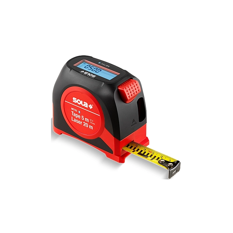 Flessometro e misuratore in un unico strumento. Indicazione digitale dei valori misurati di lunghezza, superficie e volume. Memorizzazione integrata dei valori misurati. Display LCD. Interfaccia Bluetooth per l'app SOLA Measures e SOLA Data Connector. Lunghezza nastro 5 mt, larghezza 19 mm. IP54. Funziona con 2 batterie AAA. Tolleranza di precisione +- 2 mm.