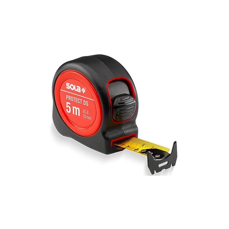 Custodia in ABS e aggancio per la cintura. Scala graduata di misurazione stampata su entrambi i lati. Nastro in acciaio con bloccaggio e rientro rapido. Classe di precisione II CE. Larghezza nastro 25 mm. Lunghezza 5 m.