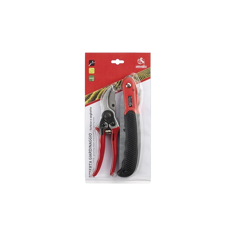 Caratteristiche forbice: corpo in alluminio, lama in acciaio speciale ad alto contenuto di carbonio. Manici ergonomici. Lunghezza 21 cm. Caratteristiche seghetto: lama in acciaio a tripla affilatura. Manico antiscivolo rinforzato. Lunghezza 18 cm.