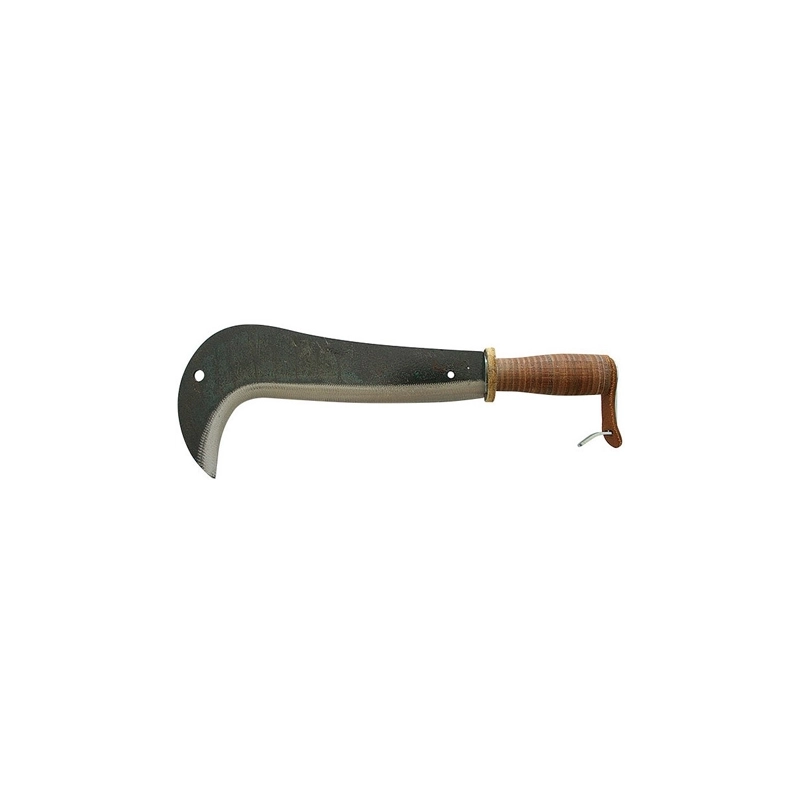 Roncola tipo Varese o tipo Trento in acciaio forgiato. Manico in cuoio con gancio. Modello = lunghezza lama cm