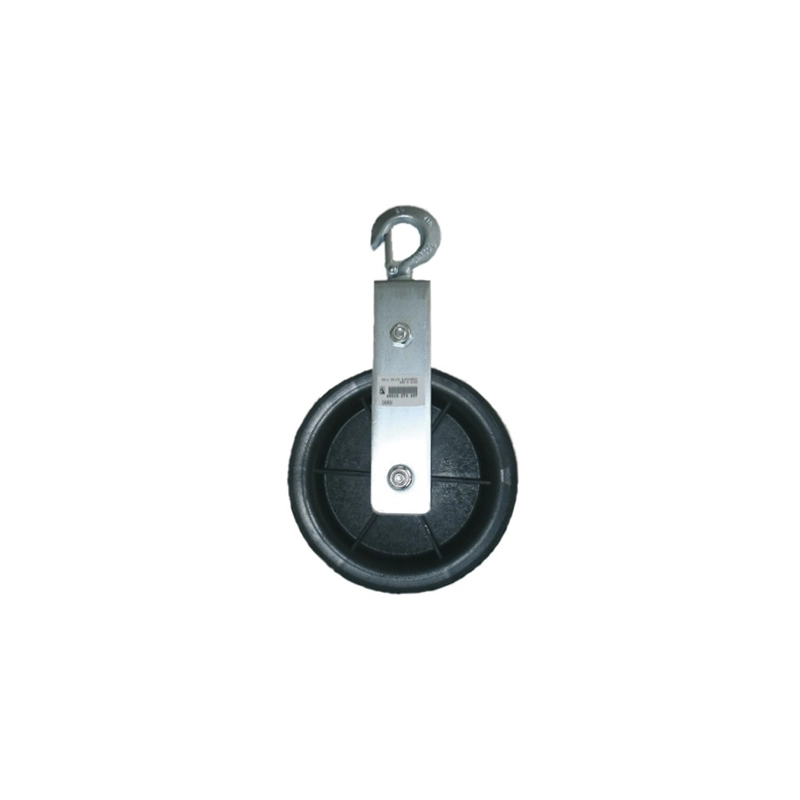Con gancio dotato di fermo di sicurezza. Gola ruota per funi dia.22mm. Diametro mm.200. Portata 50 kg.