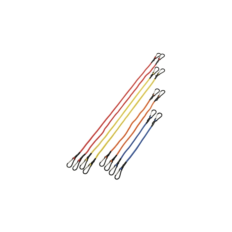 Set di 8 pezzi di elastici di varie misure (45-60-80-100 cm), diametro 8 mm. Con moschettone in alluminio. Ideali per il fissaggio di oggetti sul portapacchi di cicli e motocicli. In barattolo di plastica.