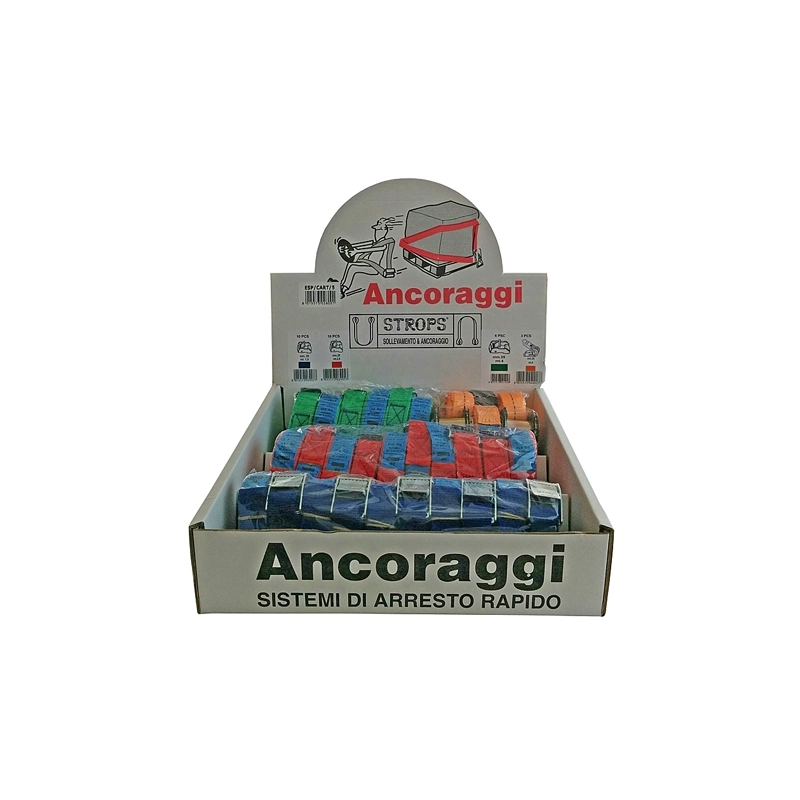 Contenuto ancoraggi con nastro di larghezza mm 25: n.10 cinghie con fibbia da 1,5 mt, n.10 cinghie con fibbia da 2,5 mt, n.6 cinghie con fibbia da 4,0 mt e n.3 cricchetti mm 25 di lunghezza 4 mt.