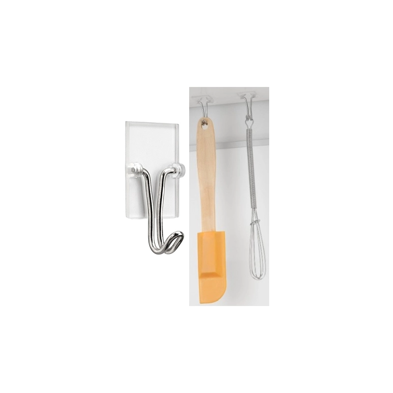 Gancio adesivo basculante in metallo con base in plastica trasparente. Possibilita' di essere attaccato su pareti verticali o al soffitto. Portata max 0,25 kg. In blister da 2 pz.