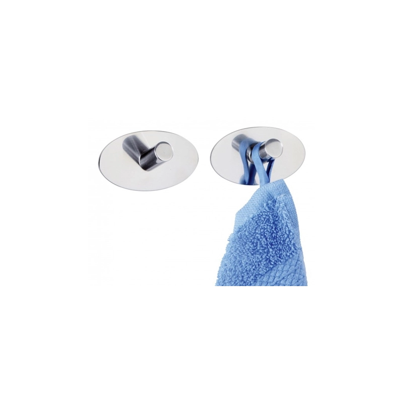 Ganci ad 1 posto. In blister 2 pezzi. In acciaio inox satinato. Applicabili con pellicola autoadesiva. Dimensioni cm 3,6x6,5x2,8.
