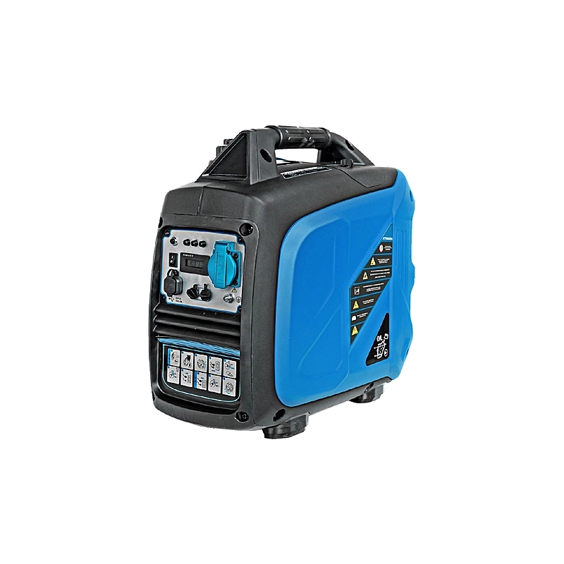 Generatore con motore 4 tempi monofase. 230V. Potenza massima in uscita 2 Kw. Carburante: benzina verde. Serbatoio da 4 lt. Autonomia 50% del carico 6 ore. Dimensioni 480x285x46 mm. Rumorosita' 67 dB. Spia sovraccarico e allarme olio insufficiente. Peso 18 kg.