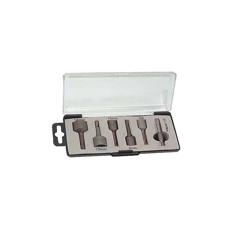 Kit 6 pz. in acciaio al cromo vanadio, finitura satinata. Composto da n.1 adattatore da 1/4' esagonale a 1/4' attacco quadro, n.5 inserti esagonali con magnete integrato da 8/10/13/14 mm e 3/8'. In box di plastica.