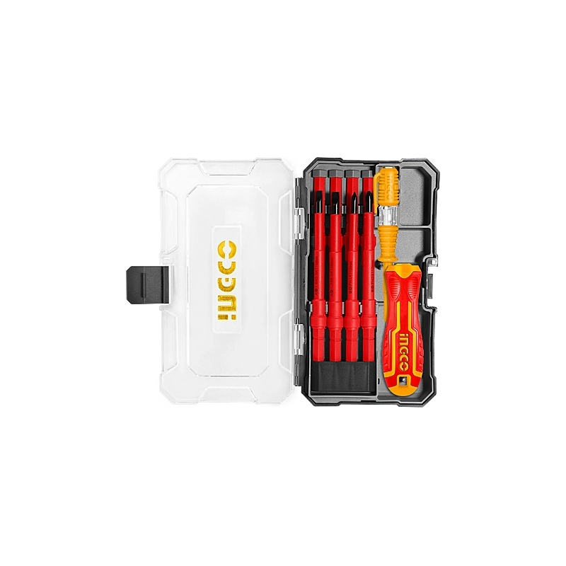 Set composto da 8 inserti isolati da 110 mm: SL2,5, SL3, SL4, SL5,5, SL6,5, PH0, PH1, PH2; 1 manico rotondo isolato intercambiabile e 1 cacciavite cercafase da 100 mm.