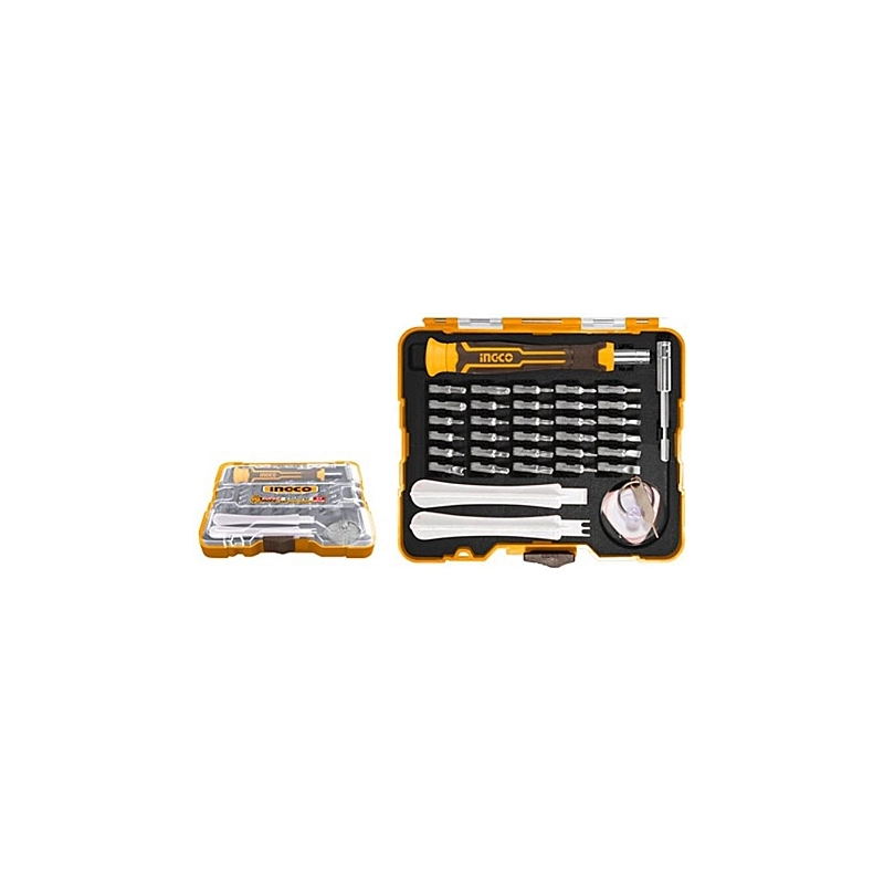 Set di cacciaviti di precisione per smartphone e tablet. Composto da 1 manico, 1 portainserti, 1 triangolo, 2 leve, 1 perno, 1 ventosa e 30 bits 4x28 assortiti.