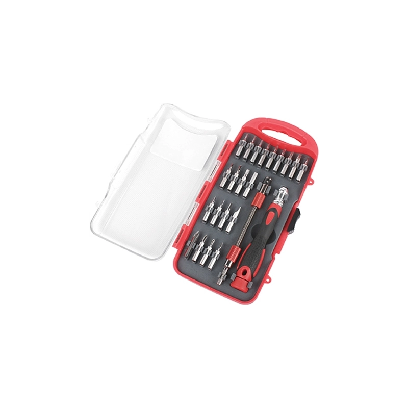Manico gommato con testa girevole. Cacciavite con prolunga porta inserti flessibile e 1 inserti: 4 pezzi phillips:PH000-PH00-PH0-PH1; 4 pezzi piatti: 1.5-2-3-4 mm; 8 pezzi torx: T5-T6-T7-T8-T9-T10-T15-T20; 5 pezzi esagonali: 1.5-2-2.5-3-4 mm.