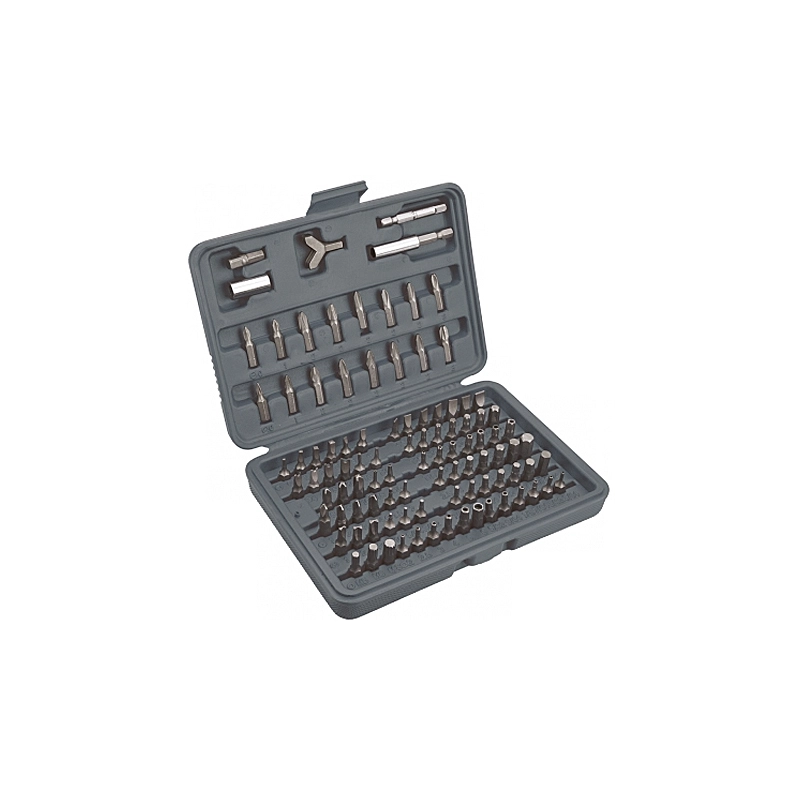 100 inserti in cromo-vanadio con attacco da 1/4" in valigetta plastica. Comprende 9 esagonali metrici, 10 esagonali in pollici, 6 esagonali metrici con foro, 6 esagonali pollici con foro, 3 stella 12 punte, 3 stella 4 punte, 4 stella 3 punte, 3 farfalla, 9 torx con foro, 9 torx, 4 forcella, 9 taglio, 4 quadri, 8 pozidrive, 8 philips, 1 portainserti esagonale, 3 adattatori, 1 forcella.