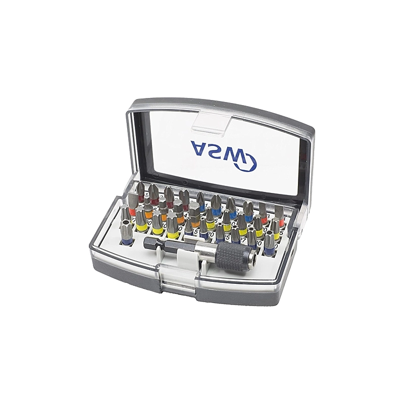Kit 31 inserti da 1/4' con sistema codice colore in acciaio S2, portainserti magnetico. Misure assortimento: 1xTX10/TX15/TX20/TX25/TX27/TX30 2xTX40, 1xTXBo10/TXBo15/TXBo20/TXBo25/TXBo27/TXBo30 2xTXBo40, HEX 1x3/4/5/6, 1xPH1, 2xPH2, 1xPH3, 1xPZ1, 2xPZ2, 1xPZ3, 1xtaglio 4,5/5,5/6,5 mm.