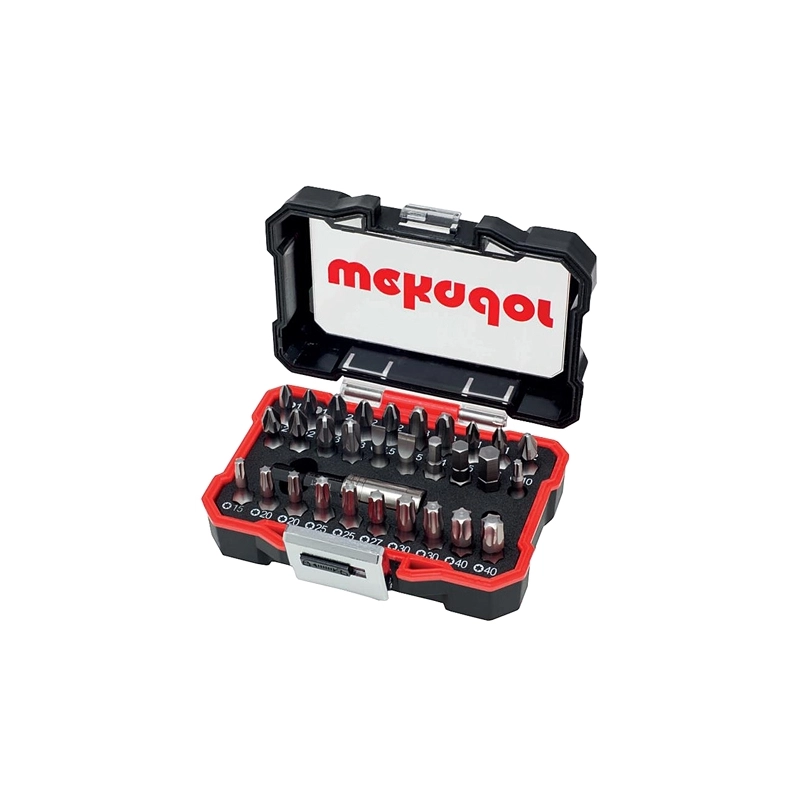 Contenuto: Nr. 2 bits a taglio (4,5 + 5,5 mm) + Nr. 3 bits esagonali (4 + 5 + 6 mm) + Nr. 11 bits torx (T10, T15, 2xT20, 2xT25, T27, 2xT30, 2xT40) + Nr. 7 bits a croce PH (2xPH1, 3xPH2, 2xPH3) + Nr. 7 bits a croce PZ (2xPZ1, 3xPZ2, 2xPZ3) + Nr. 1 portainserti magnetico