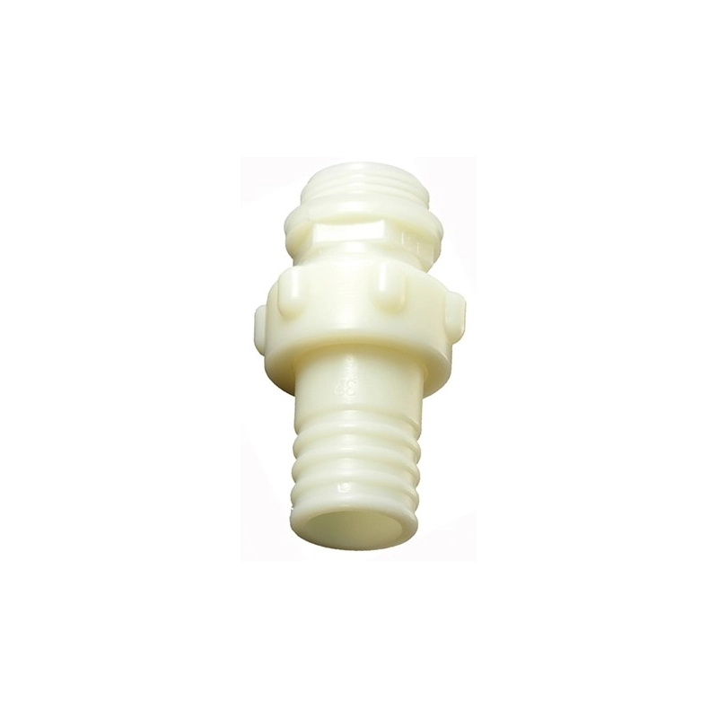 Raccordo in tre pezzi diritto tubo/filetto con accoppiamento conico. In plastica poliammide PA66 colore naturale. Connessione tubo DN. Pressione max di esercizio 10 bar a 20 gradi C. Modello = filetto pollici/diametro tubo mm