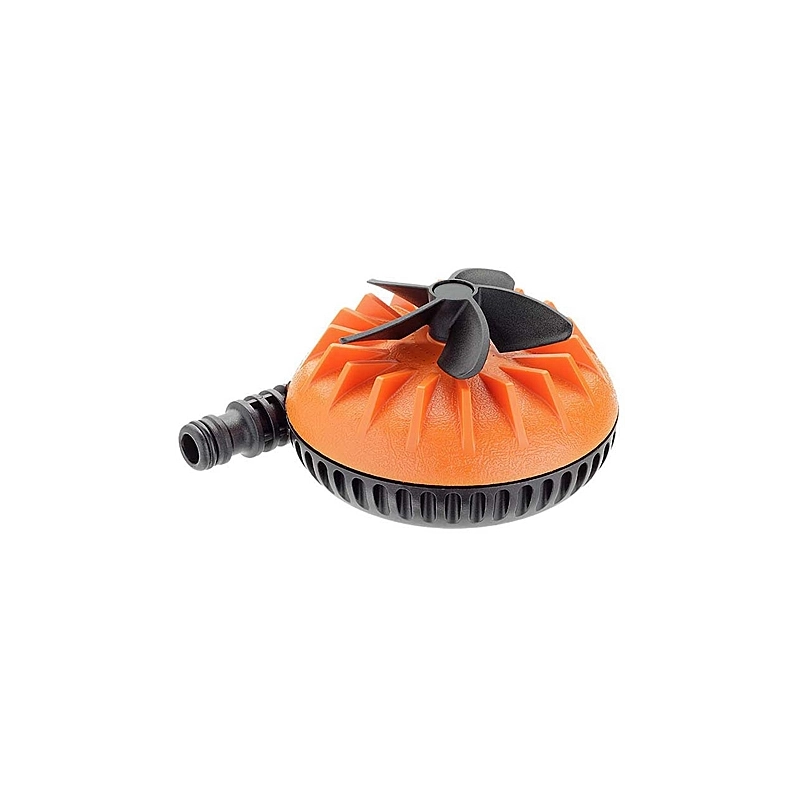 Irrigatore che consente un'irrigazione uniforme, delicata e senza ristagni. Funziona anche a basse pressioni. Elica a 5 pale che rompe il getto d'acqua e lo trasforma in pioggia naturale finissima. Copertura max 20 m2.