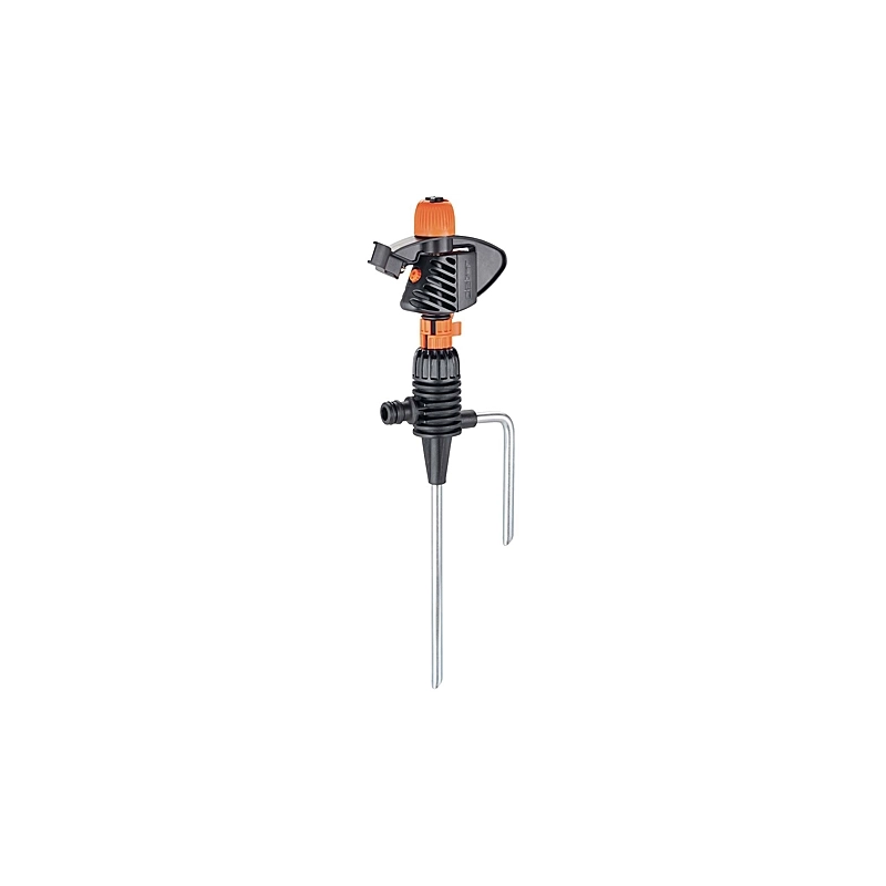Irrigatore a intermittenza, si pianta nel terreno grazie al doppio puntale. Funzionamento ad alte e basse pressioni. Per irrigazione a settori da 0 a 360 gradi oppure a rotazione continua. Vite rompigetto per una migliore uniformita'. Area massima irrigata 397 m2.
