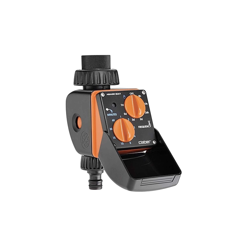 Programmatore automatico a una via. 63 programmi prefissati (+ off e 5 minuti test). Facile programmazione con 2 manopole rotative (una con 7 frequenze e l'altra con 9 tempi d'irrigazione). Dotato di filtro lavabile. Attacco rubinetto 3/4''. Funziona con batteria alcalina da 9V. Pressione d'esercizio da 0,5 a 10 bar.