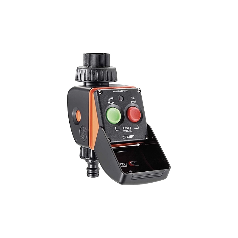 Programmatore a due pulsanti (verde e rosso). Memorizza il tempo intercorso fra le due operazioni (verde poi rosso) e ripete il programma, durata max 60 minuti, tutti i giorni alla stessa ora. Dotato di filtro lavabile. Attacco rubinetto 3/4''. Funziona con batteria alcalina da 9V. Pressione d'esercizio da 0,5 a 10 bar.