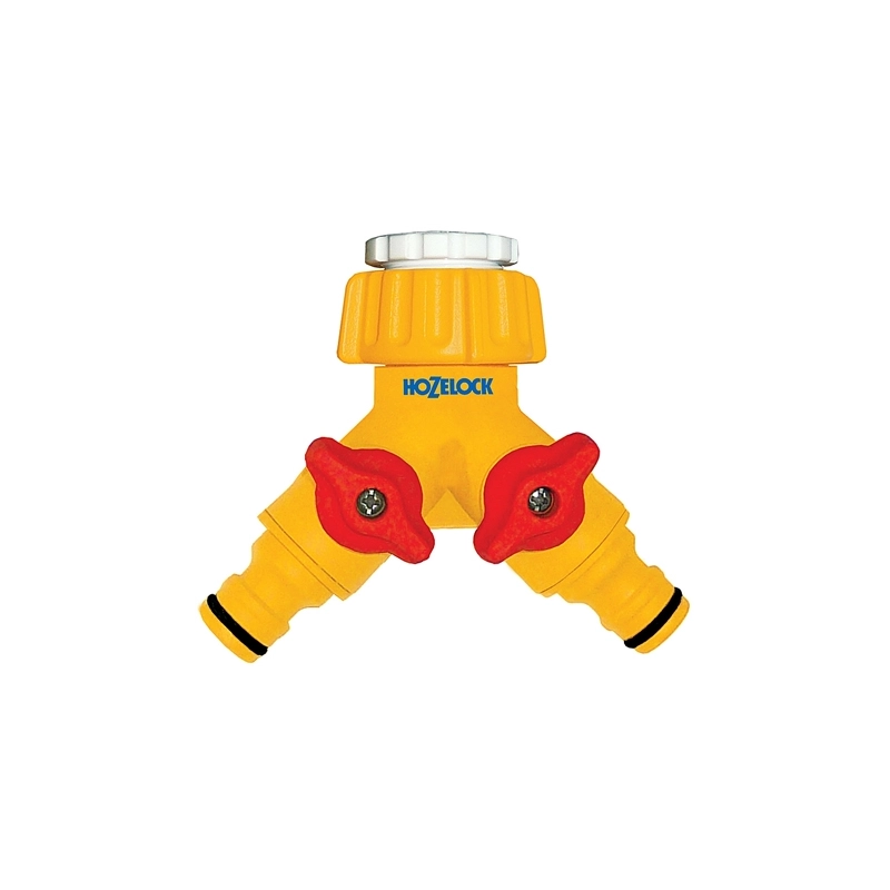 Consente di collegare due tubi ad un rubinetto. Raccordo con valvole per rubinetti da 3/4'' con riduzione da 1/2''. In blister.