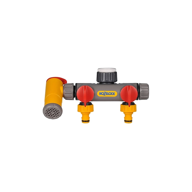 Raccordo per la connessione di due tubi al rubinetto esterno da 1'' / 3/4'' / 1/2''. Composto da 2 prese con raccordo rapido e valvola e un'uscita orientabile per l'erogazione dell'acqua. Ideale per l'impiego con sistemi automatici di irrigazione e timer.