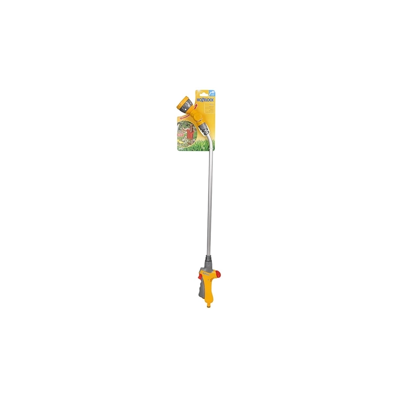 Manico fisso da 90 cm. Rosone regolabile con 5 scelte di spruzzo: getto, cono, concentrato, ventaglio e doccia. Leva per il controllo del flusso con blocco progressivo. In blister.