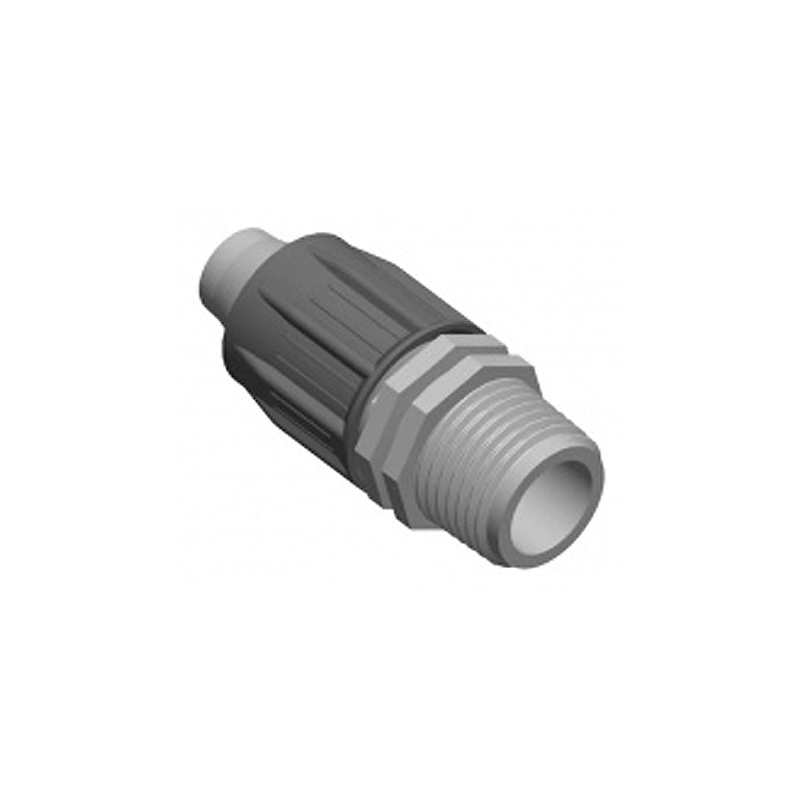 Raccordo con un lato ghiera di serraggio per tubo in PE e da un lato filetto da 1/2" per ala gocciolante. Modello = per tubo in PE diametro mm