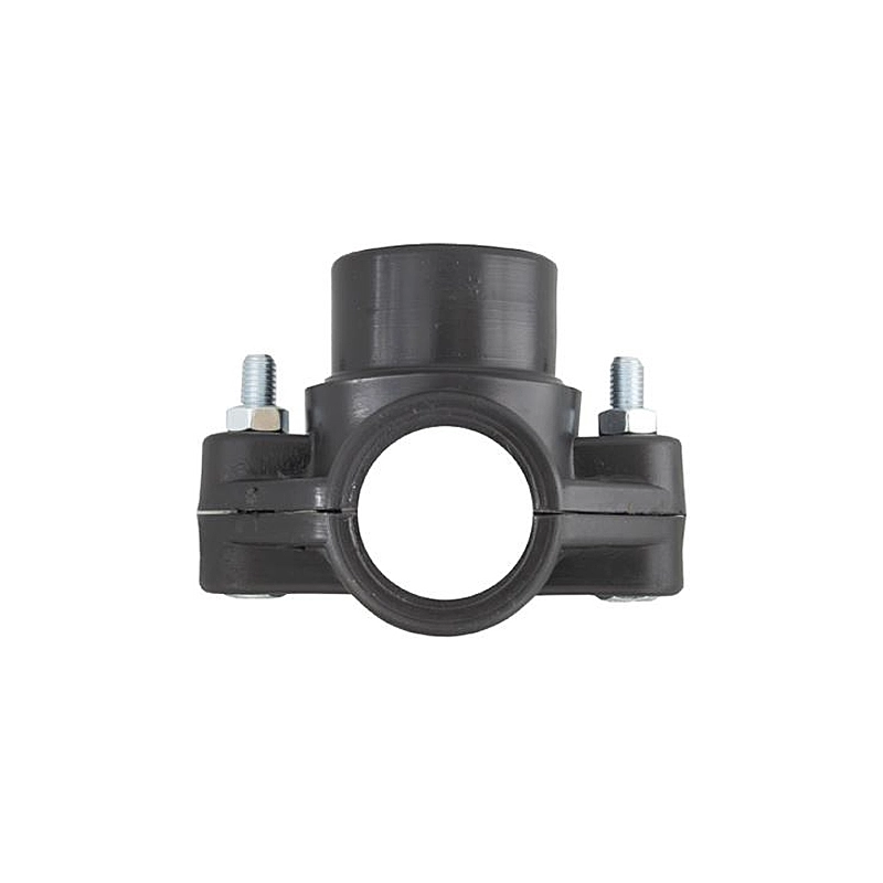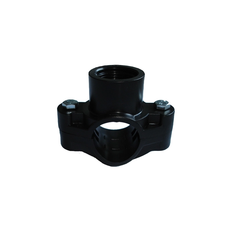 Presa a staffa con anello di rinforzo e attacco femmina per tubi in PE tipo PN16. Modello = diametro mm x filetto