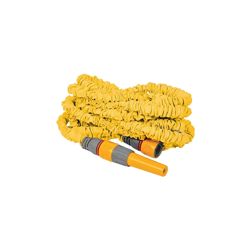 Tubo estensibile in poliestere. Anti-attorcigliamento. Completo di accessori: 2 raccordi acquastop, 1 lancia, 1 presa rubinetto 3/4''-1/2'. Modello = lunghezza minima mt/ lunghezza massima mt