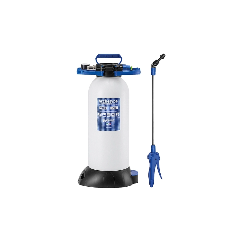 Pompa a pressione con serbatoio da l 11. Pressione massima 3 bar. Sistema brevettato per messa in pressione con pompante a mano o con raccordo compressore. Tubo da 2 mt. Manometro incluso. Porta lancia verticale. Lancia curva con ugello regolabile e a ventaglio. Con cinghie imbottite impermeabili.