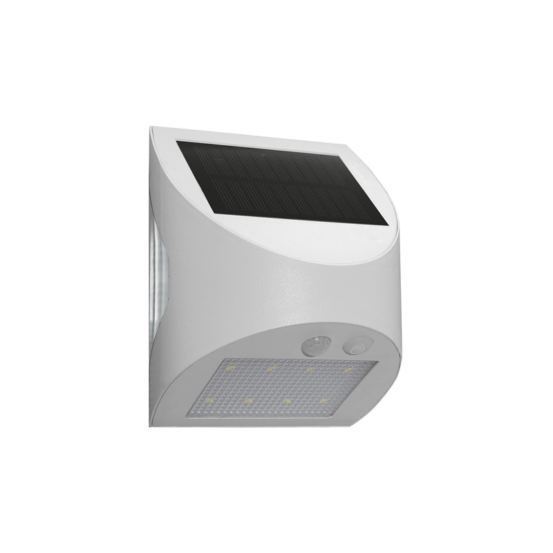 Lampada Led con pannello solare da esterno con rilevatore di presenza. IP65. 2 modalita' di funzionamento: si accende automaticamemte al calare della sera e quando il sensore registra il passaggio di una persona si accende per 30 secondi la luce anteriore oppure modalita' spenta con accensione per 30 secondi solo alla rilevazione di movimento. 4000K. Modello = Watt/Lumen