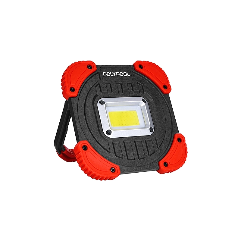 Proiettore COB LED 10W ricaricabile e portatile da esterno. Realizzato in tecnopolimero antiurto ad alta resistenza meccanica. IP44. 6500 K. 600 lumen. Durata 30.000 ore. 2 batterie 1200 mAh al litio incluse. Con presa USB powerbank 1A per la ricarica di dispositivi USB.