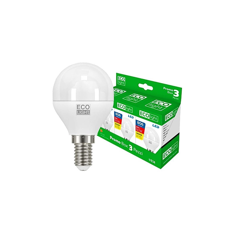 Attacco E14. Luca calda 3000 K. Durata media 20000 ore. 6 Watt, 490 Lumen. Dimensioni 45x80 mm. In box da 3 pz.