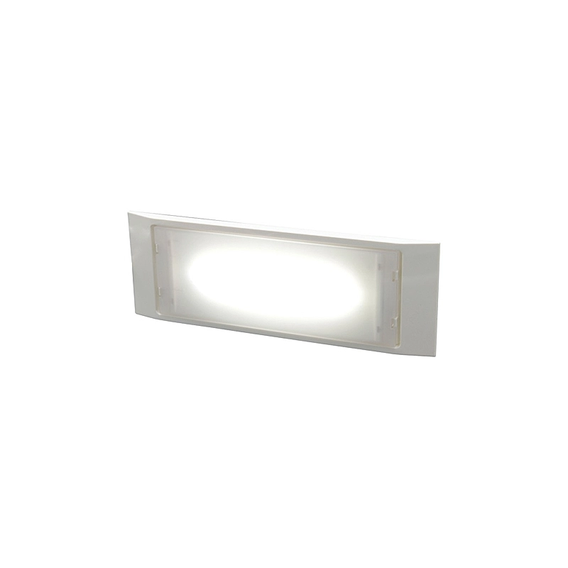 Lampada di emergenza Led fissa. 140 lumen, autonomia 2 ore. Extra slim: 32 mm di spessore. Da interno o da esterno, installabile anche ad incasso. Puo' essere usata sia in SA (sempre accesa) che in SE (solo emergenza). IP65. 3,5 Watt. 6500 K. IK08. Certificata EN60598-2-22.