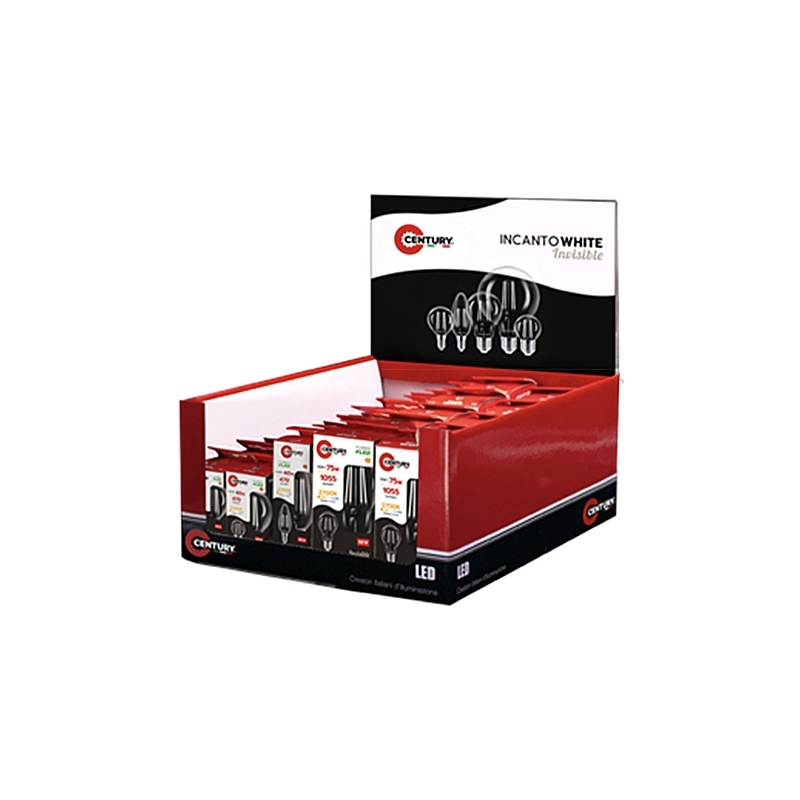 Espositore composto da: 8 lampade candela 4,5 W - E14 - 470 lumen, 7 lampade sfera 4,5 W - E14 - 470 lumen, 7 lampade sfera 4,5 W - E27 - 470 lumen, 5 lampade goccia 9W - E27 - 1055 lumen, 5 lampade goccia 7,5 W - E27 - 806 lumen. Tutte le lampadine 2700 K.