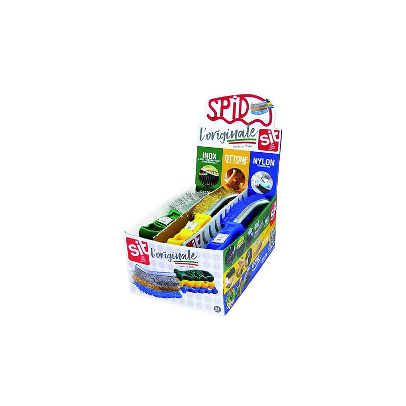 Espositore contenente 21 spazzole Spid (7 per tipo) assortite tra spazzole inox, spazzole ottone e spazzole in nylon