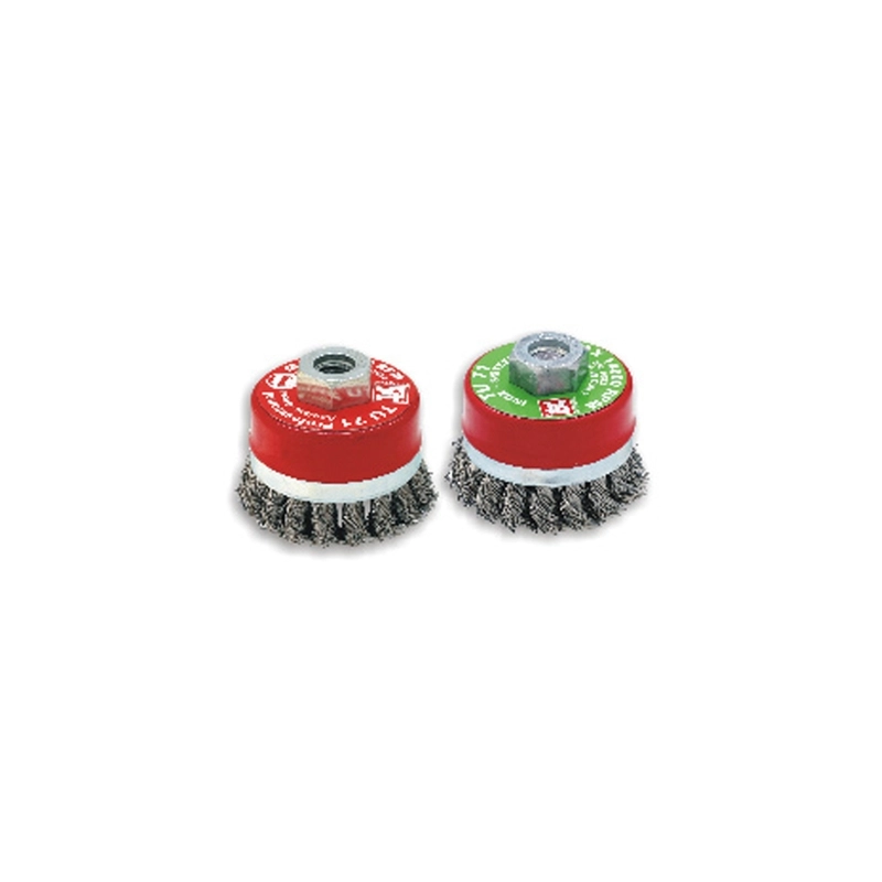 Spazzole professionali con filo in acciaio diametro mm 0,35 ritorto in trefoli. Progettata per operare ad elevati regimi di rotazione (circa 13.500 giri/min). Dimensioni mm 70x18. Attacco M14.