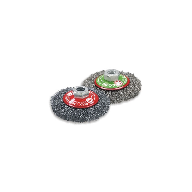 Spazzola professionale conica con filo in acciaio ondulato diametro mm 0,3 ad alta resistenza.Progettata per operare ad elevati regimi di rotazione (circa 14.000 giri/min). Dimensioni mm 90x20. Attacco M14