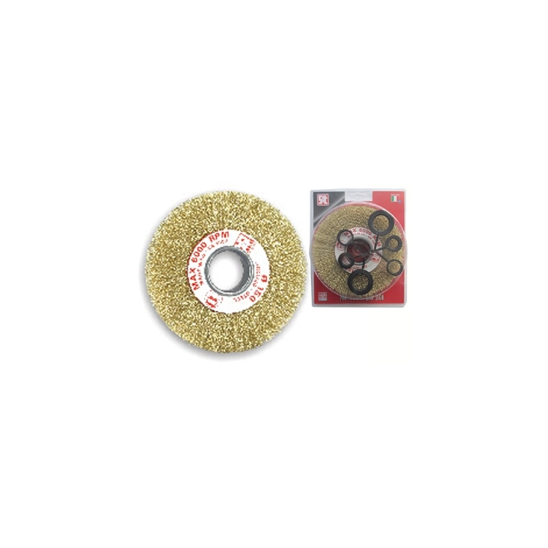 Spazzola circolare per mola. Con filo acciaio ottonato diametro mm 0,3. Progettata per operare a regimi di rotazione (circa 6.000 giri/min). Dimensioni mm 150x20. Foro dia mm 38. Kit di riduzione foro da 16-20-25 mm.
