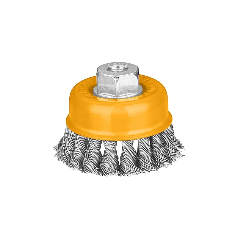 Spazzola a tazza con mazzetti ritorti. Diametro del filo 0,5 mm. Attacco M14x2. Modello = diametro mm