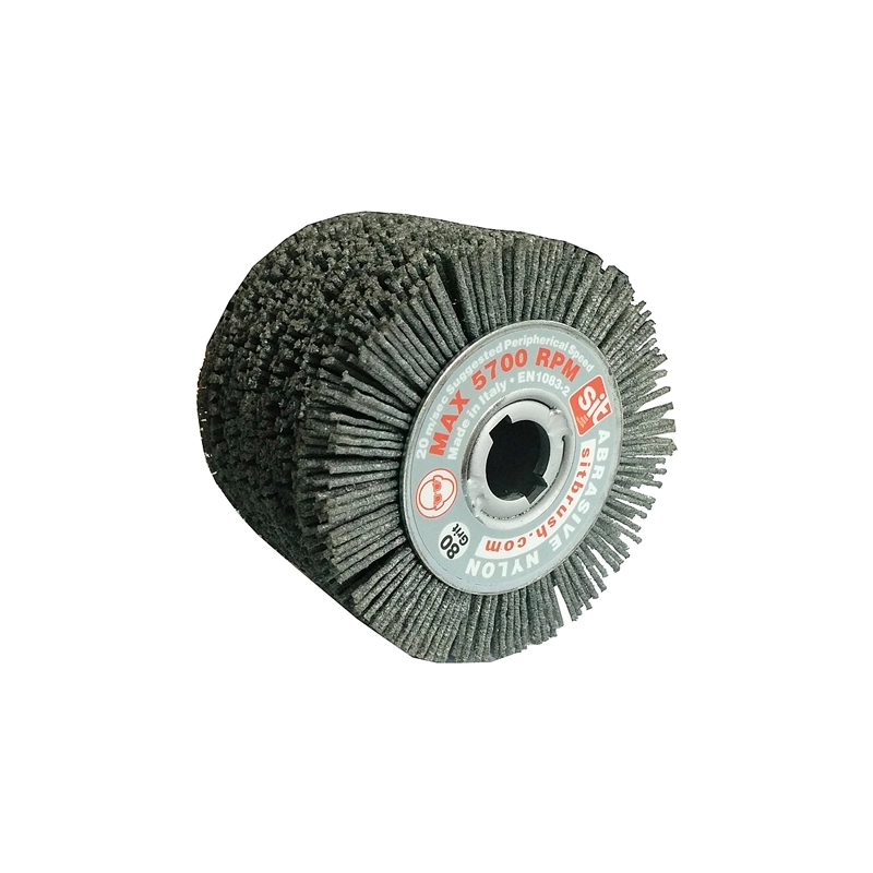 Spazzole cilindriche a rullo in nylon abrasivo Tynex spiralate per spazzolatrici e macchine satinatrici tipo Flex, montabili anche su smerigliatrici angolari (solo macchine da mm 230 a 6500 giri) tramite albero adattatore (optional). Dimensioni 100x70 mm. Rotazione max 5700 giri/min.