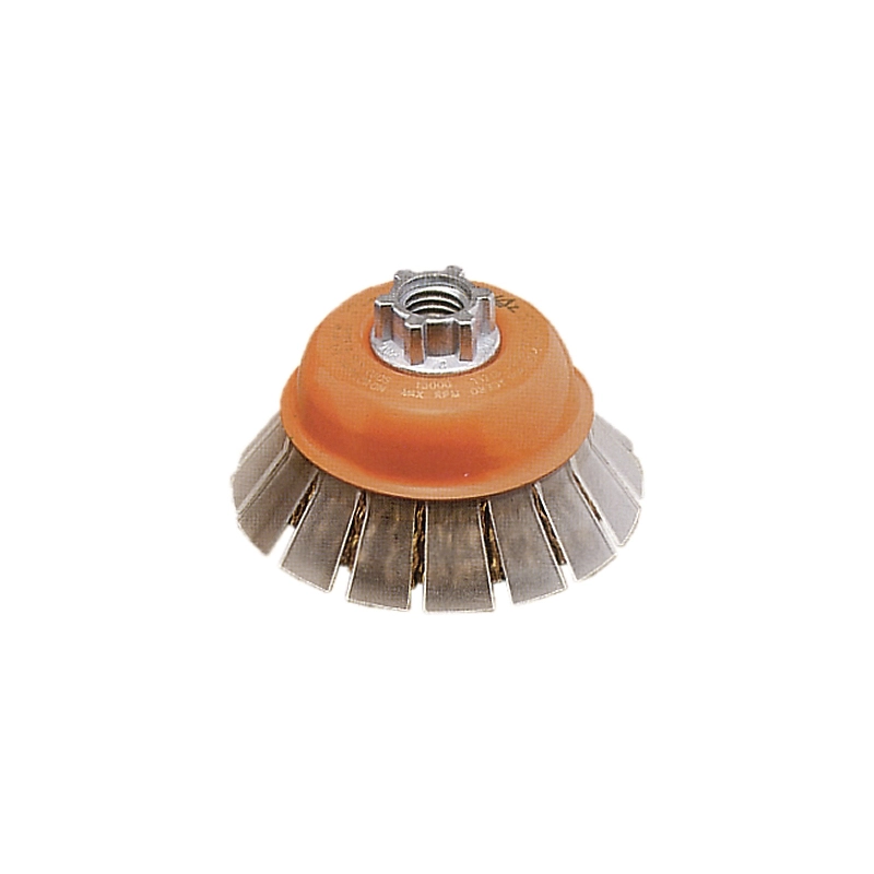 Progettata per utilizzo su elettroutensili portatili. Adatta per lavorare su superfici estese. Filo in acciaio ritorto in trefoli. Diametro spazzola mm 75. Spessore corona fili mm 22. Attacco M14. Rotazione max 13000 giri/min.