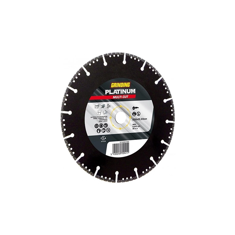 Disco diamantato con corona con asole di sfogo. Consente un taglio rapido su un'ampia gamma di materiali da costruzione, ghisa duttile, plastiche, composti rinforzati con fibra di vetro e legno, generalmente difficili da tagliare con i dischi diamantati tradizionali. Foro da 22,2 mm. Modello = Dimensioni mm/max giri-min