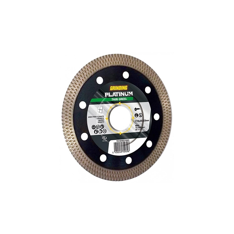 Disco sinterizzato con corona continua di altezza 10 mm con geometria reticolata. Flangia rinforzata. Ultrasottile per tagli veloci e ancora piu' precisi senza sbeccature. Dimensioni 115x1,4 mm. Max 13000 giri/min. Foro 22,2 mm. Applicazione: Gres porcellanato, piastrelle dure, monocottura, bicottura, marmo, terracotta e granito.