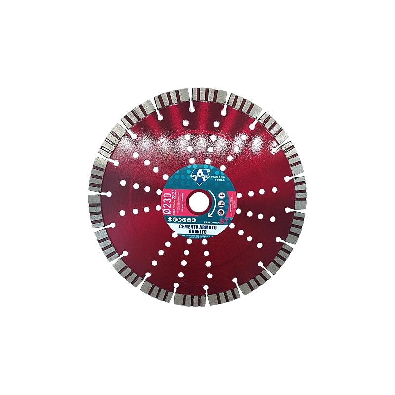 Disco diamantato professionale a settori, saldatura al laser. Ideale per cemento, cotto, betonella, arenaria, poroton, granito e mattoni. Adatto anche porfido, klinker, tufo, cemento armato e ghiaino lavato. Foro da 22,2 mm. Diametro 230 mm. Altezza corona 10 mm.