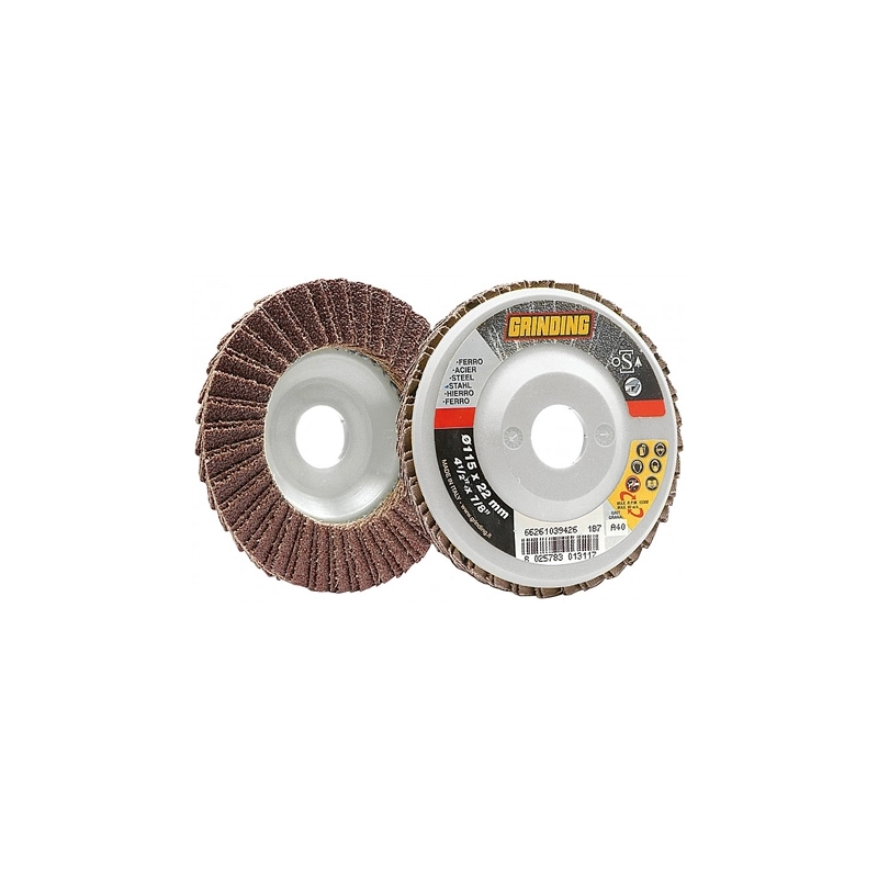 Dischi a lamelle in tela d'ossido di alluminio con sviluppo radiale sovrapposto, per la levigatura di punti di saldatura, spianatura, finitura di superfici a vista. Modello = dimensioni mm./grana