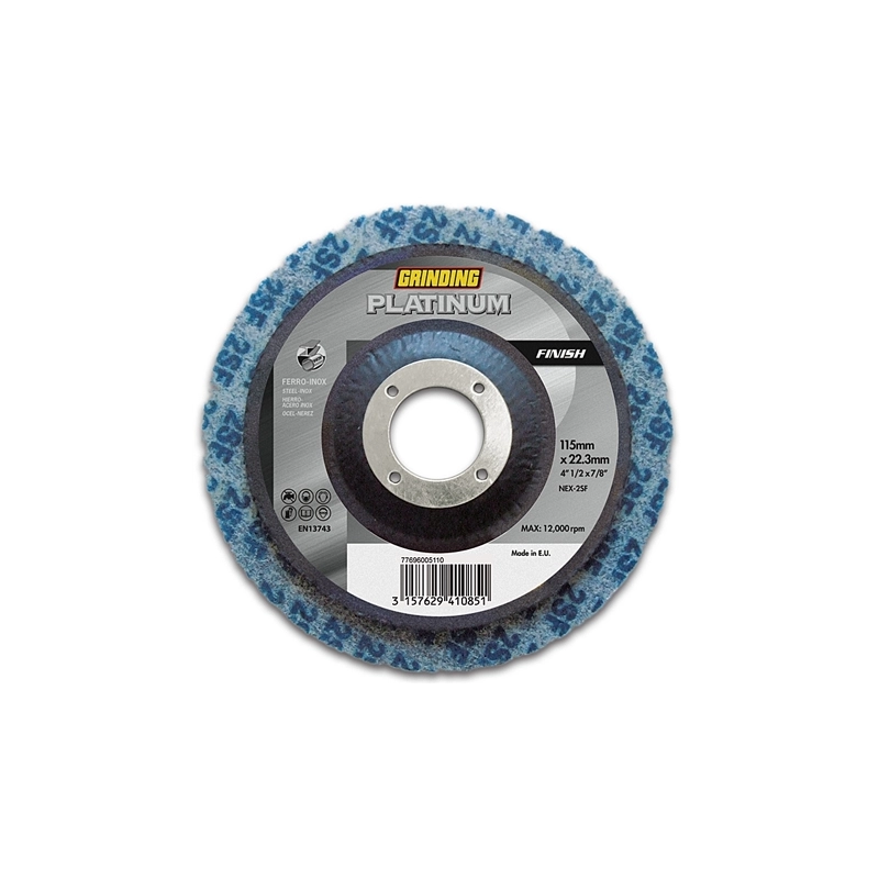 Disco costituito da una particolare corona circolare incollata sul supporto di fibra di vetro. Essa e' composta da una maglia chiusa di filamenti continui di reti in tessuto non tessuto in cui sono impregnati granuli di abrasivo uniformemente distribuiti. Supporto in fibra di vetro, ideale per lucidatura. Dimensioni disco: diametro 115 mm, altezza 22 mm.