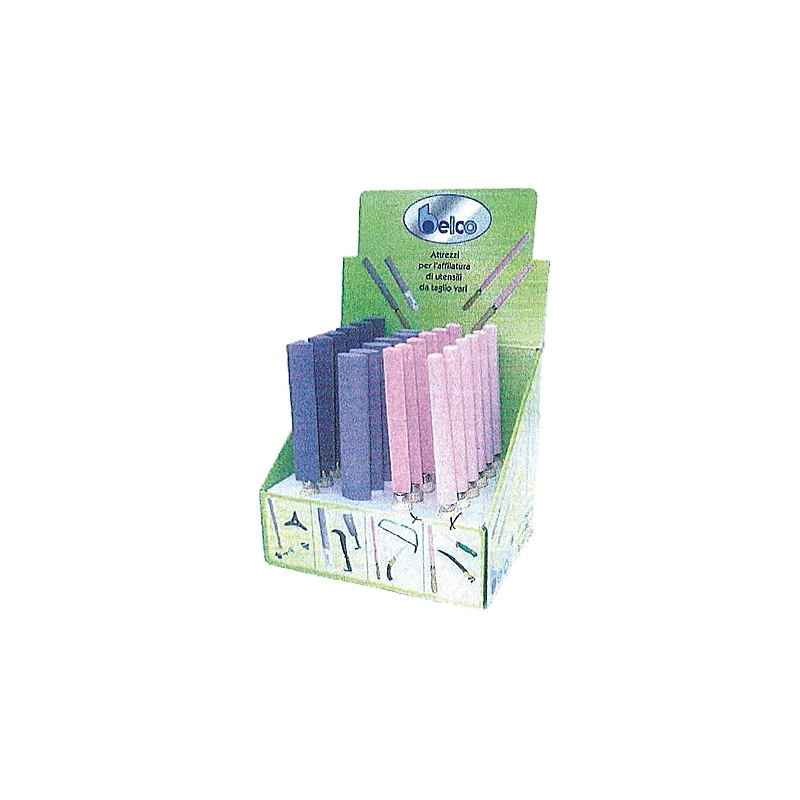 Espositore da 24 lime smerigliate. Composizione espositore: n.6 lime triangolari per falciatrice, n.6 lime triangolari per seghe rosa, n.6 lime coniche rosa, n.6 pietre coti ovali.