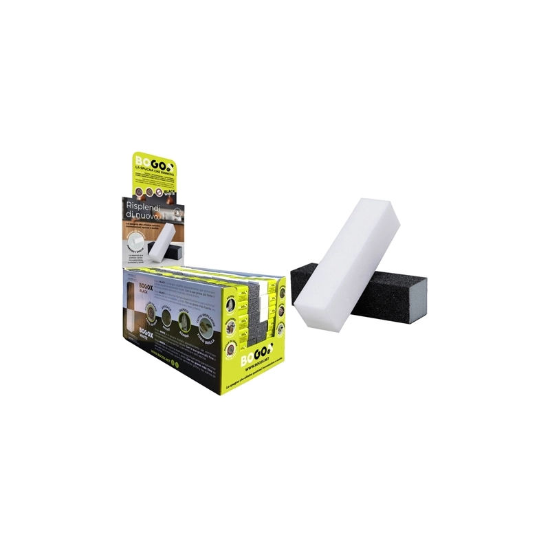 Spugna Bogox nera per eliminare qualsiasi tipo di incrostazione, ossidazione e sporco. Grana forte efficace su prodotti domestici in acciaio, ottone e ferro. Spugna Bogox bianca per eliminare qualsiasi tipo di incrostazione e calcare. Grana fine indicata per cromature, sanitari, rubinetteria e vetri doccia. Disponibile espositore con 49 spugne nere e 49 spugne bianche. Modello = colore