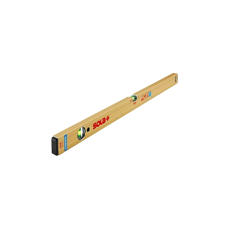 Struttura in profilato di alluminio con lato smussato, dotata di magneti al neodimio montati all'interno del profilo. Finitura anodizzata oro. Nuova bolla brevettata FOCUS ad alta visibilita'. Tolleranza di misurazione in posizione standard 0,5 mm/m, capovolta 0,75 mm/m. Dimensioni mm 50x24 Bolle: 1 orizzontale - 1 verticale. Modello = art./lunghezza cm