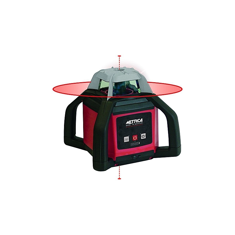 Laser rotante autolivellante con rivestimento in gomma antiurto. Portata 500 mt con ricevitore. Funzioni: piano orizzontale, piombo alto e basso, scanner, tilt, inclinazioni manuali assi X e Y. Batterie ricaricabili NiMH. IP66. Laser 635 nm (Classe 2). Precisione +/-3 mm/30 m. Attacco 5/8". Dimensioni 220x220x210 mm. In dotazione telecomando, ricevitore, caricabatterie, occhiali e valigia.